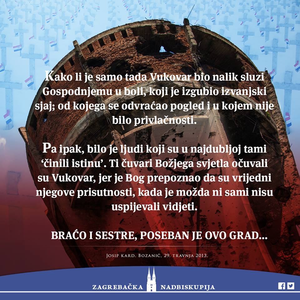 Who will watch my city, my friends, who will carry Vukovar from the dark? There aren’t shoulders stronger than mine or yours, and therefore if it isn’t too much for you, if there still remains in you a youthful whisper, join us. Somebody has touched my parks, the benches that still have your names carved into them, that shadow that you gave it at the same moment, and received your first kiss – somebody has simply stolen it all, because how do you explain that not even a Shadow remains? There isn’t that store window in which you admired your personal joys, there isn’t that movie theater in which you saw the saddest film, your past has been simply decimated and you have nothing. You must build anew. First your roots, your past, and then your present, and then if you still have the strength, invest in the future. Do not be alone in the future. Do not worry about the city, it has been with you all this time. Only hidden. So that the murderer cannot find it. The city – it is you.