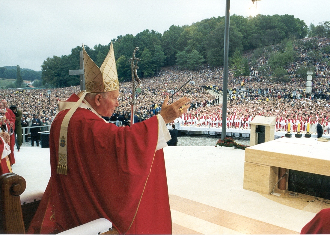 Foto: “Najveći bistrički Hodočasnik”, sada svetac, Ivan Pavao II., papa na misi proglašenja blaženim zagrebačkog nadbiskupa i kardinala Alojzija Viktora Stepinca, 3. listopada 1998. godine. Blagoslivlja hodočasnike koji su prekrili “Stepinčevu marijabistričku kalvariju”.